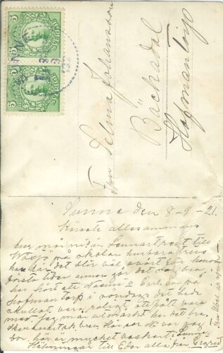 Farfars syster Sigrid skickade ett vykort till farmor, Selma Johansson, 8 september 1921. Farfar Arvid och Selma bodde vid den tiden i Hovmantorp. Min far var då 11 år. Kortet är från Sunne i Värmland. Sigrid arbetade som fotograf. Tyvärr är hennes livsverk försvunnet. Nästan alla hennes bilder har försvunnit. Hennes syster Naemi, farfar eller brodern Gunnar tog över eventuella tillhörigheter efter Sigrid. Jag vet att farfar eller farbror Sigge tog emot ett antal böcker från Sigrids dödsbo, för de har jag en del av. De är framför allt av frireligös art.