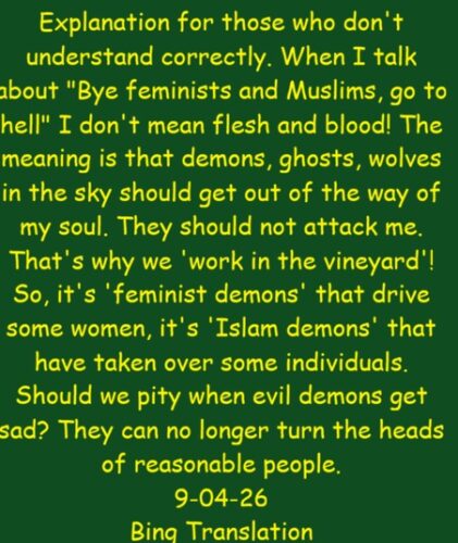 Hej då feministdjävlar och muslimdjävlar, dra åt helvete, för nu ska jag framåt och uppåt! Vingårdsarbetet är verkligen något särskilt och de flesta finner det aldrig. Jag tänkte, vem är yngst i skapelsen? Jo den äldste i Himlen – Gud Fader som är äldst, är också den som skapat alla unga och är själv den yngste, den evigt unge. Gud skapade allt därför att Han älskar en Himmel där frid, kärlek och harmoni råder. Och den förstfödde var den Enfödde Sonen, Konungarnas Konung – Jesus. Det är bara att inse det!